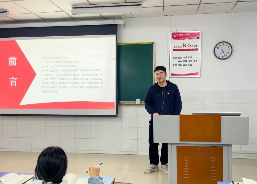 本次党课的主题《端正入党动机,争做合格党员》,本次党课主要内容是如何端正自己的入党动机,侯丁琳老师开篇引用今年热门电影《长津湖》来让同学们谈谈自己对影片的看法,同学们积极呼应老师,说出影片带来的深刻印象和当年红军艰苦战斗的经典场景所引发的感慨。随后提出当前大学生党员存在的主要问题。学员们深入思考,举手发言,讲出自己对大学生党员存在问题的理解。刘天宇老师对大家参与党课应该保持的状态做出了指正,对积极参与党课的同学非常赞赏。然后,刘老师从“入党动机是什么”这个问题切入课题,进行初步讲解。刘老师表示正确的入党动机是言行一致,既要在组织上入党,也要在思想上入党。同学们更加了解在大学阶段如何做好一名预备党员,如何开展和支持党的工作,如何树立踏实肯干的工作作风,如何服务同学,为学生党员的素质及党性修养的提高奠定了坚实的基础。