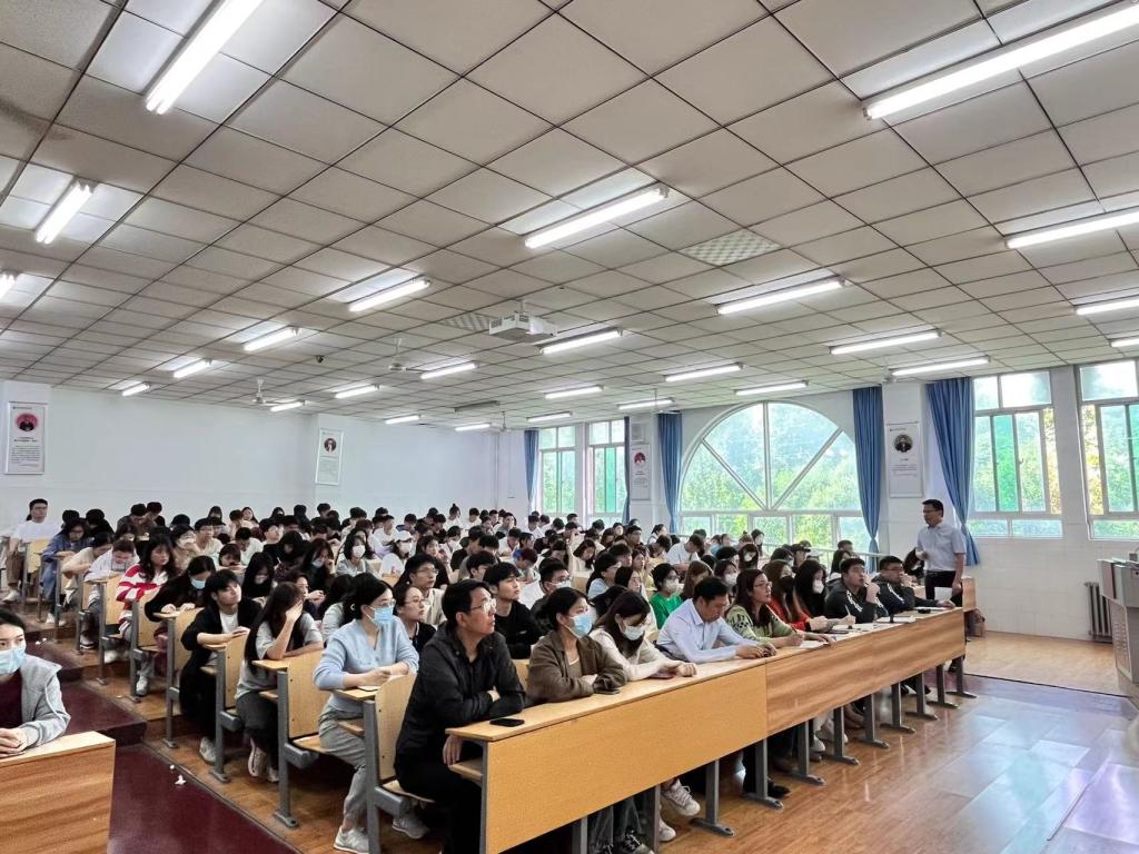 为深入学习宣传贯彻党的二十大精神,推动学院高质量发展,5月11日下午,新葡的京集团8814检测站院长胡晓波以《新发展格局下高质量中外合作办学教育体系的思考与实践》为题作辅导报告。此次报告也是学院学习宣传贯彻党的二十大和全国“两会”精神培训班的第四讲。学院全体教职工,学生党员、积极分子代表等180余人参加报告会。
