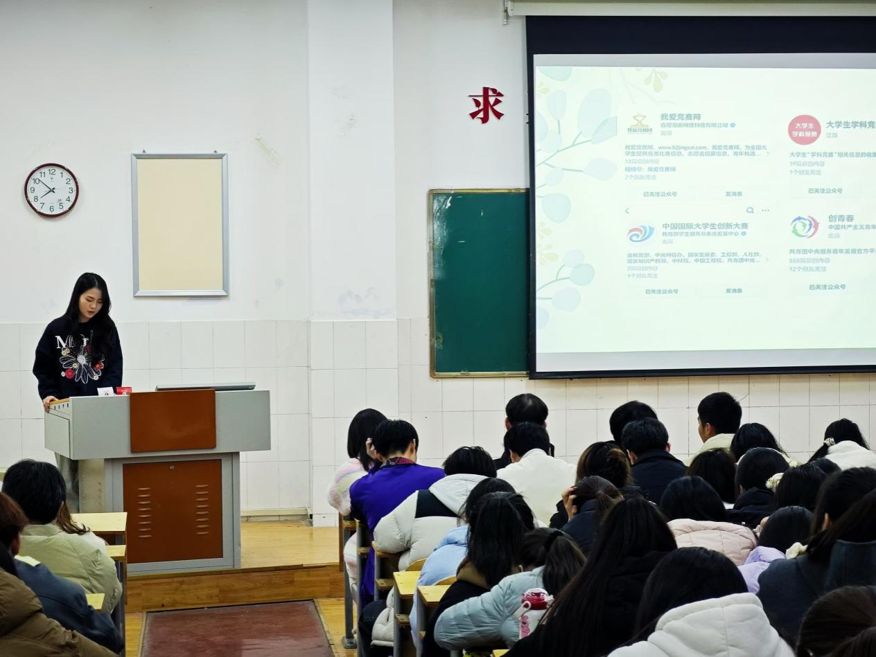 宣讲伊始,梅灵童通过PPT把学院各级各类学科竞赛的报名参赛流程、学生参加学科竞赛的重要意义、学院学科竞赛取得的优异成绩等内容进行了详细介绍。接着,廖文静从专业角度出发,介绍了各专业可参加的各类比赛,并向大家分享了一些学科竞赛参与途径和备赛技巧。最后,李明奇从自身经历出发,就参赛中的团队合作、备赛心态、突发情况处理等方面的问题进行了经验分享。宣讲现场,各班学生认真聆听,积极提问,展现了我院学生对参加学科竞赛的热情和信心。活动结束后,学生纷纷表示,本次活动帮助他们打破了信息壁垒,减轻了参赛畏难情绪,进一步明确了专业方向。